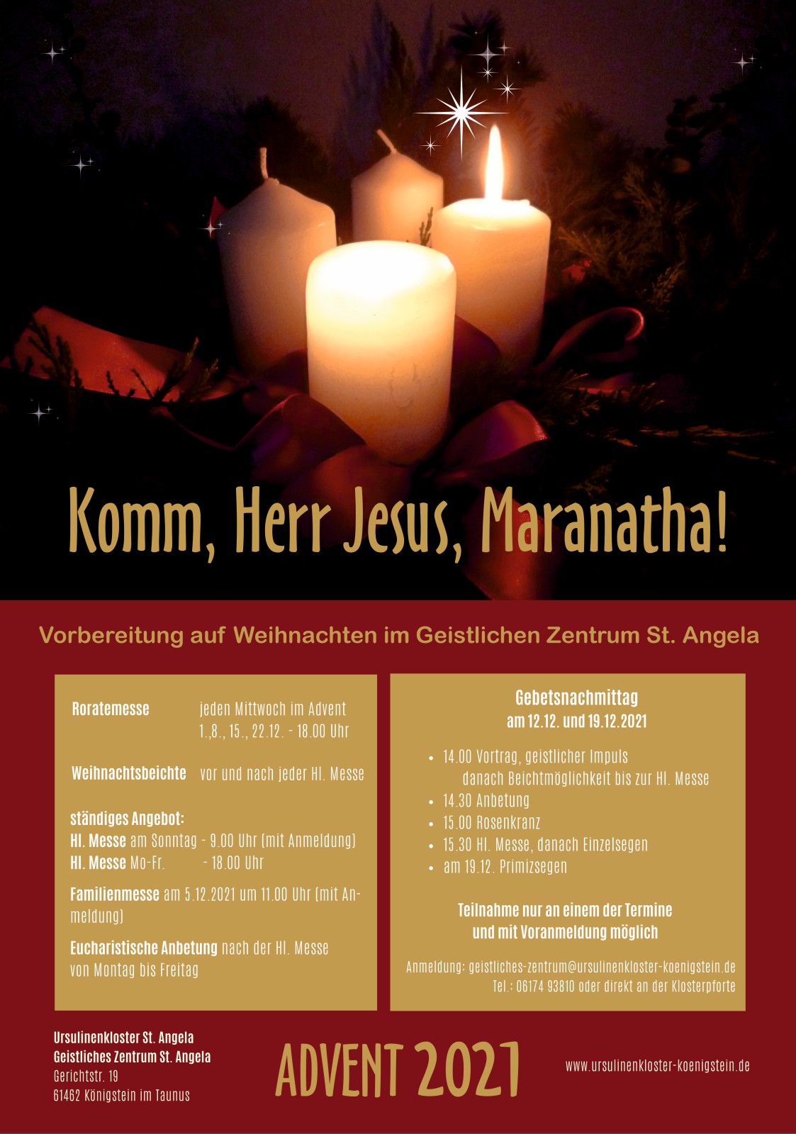 Advent – Zeit des Wartens auf das Kommen Jesu. Wir laden Sie herzlich ein, sich gut darauf vorzubereiten… Alle Angebote des Geistlichen Zentrums finden Sie im Veranstaltungskalender des Geistlichen Zentrums und zusammengefasst auf dem Plakat: