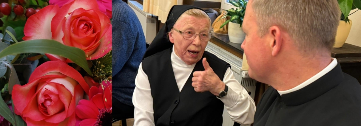 Der vergangene Samstag, der 18. November 2023, an dem es draußen unglaublich regnerisch und neblig war, sah bei uns drinnen im Kloster vollkommen anders aus – sonnig und froh… Der Grund dafür war ein Ereignis, das nicht oft vorkommt, und wenn doch, dann meist nicht so ausgelassen begangen werden kann… Wir feierten den 90. Geburtstag unserer Schwester Johanna, zusammen mit Kirchenbesuchern, die an der hl. Messe am Morgen teilgenommen hatten und dann zum Frühstück eingeladen waren, dann später das Mittagessen mit allen Königsteiner Ursulinen, den Patres der Gemeinschaft der Legionäre, mit Freunden, Bekannten, Mitarbeitern des Klosters und anderen Gratulanten.