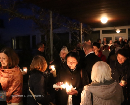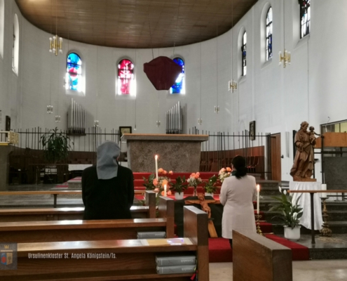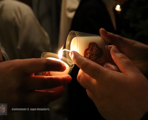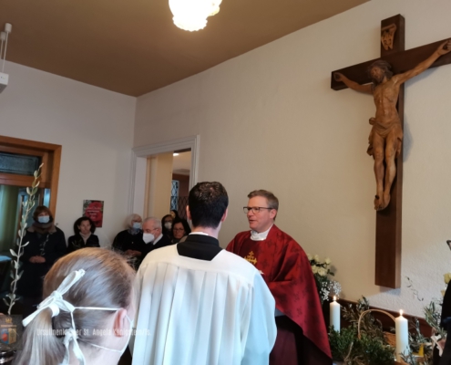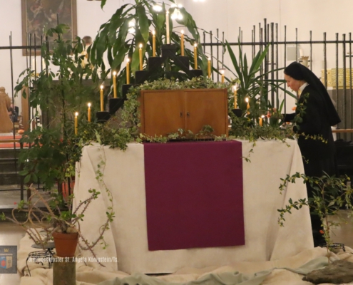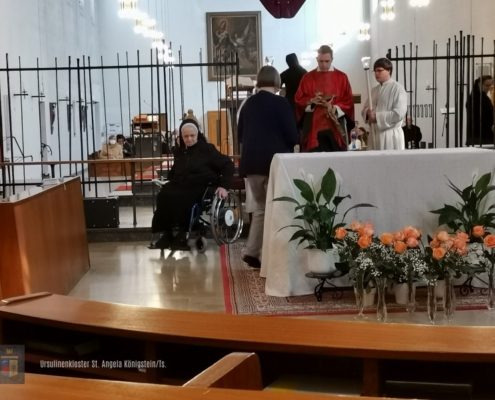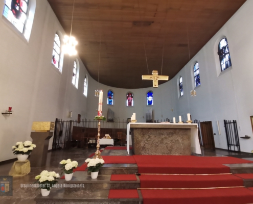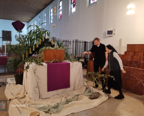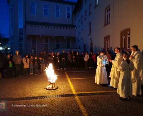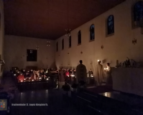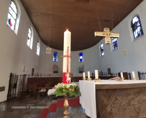 Mit Dank blicken wir zurück auf eine ereignisreiche Karwoche, die wir mit so vielen Kirchenbesuchern begehen konnten – angefangen am Palmsonntag mit einer Prozession, der ersten seit drei Jahren, am Mittwoch der Karwoche noch die letzte Fastenpredigt und dann schon die Liturgie des Gründonnerstags – mit Fußwaschung und dann Anbetung im Garten Gethsemani mit Ölbergstunde – alles vorbereitet von Pater Konstantin und Sr. Katarina, der Karfreitag mit Kreuzweg und Kreuzverehrung, an der auch viele Gläubige teilnahmen, auch viele junge Menschen, neue Personen, die in diesen Tagen den Weg nach Königstein, in unsere Kirche gefunden haben.