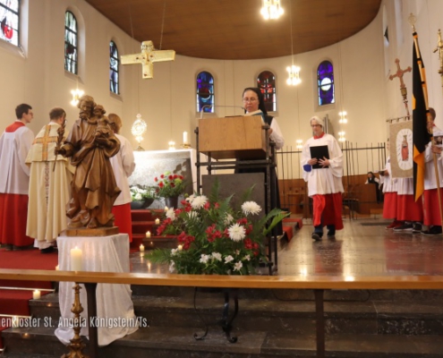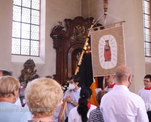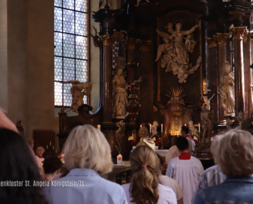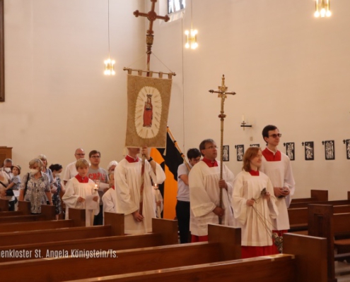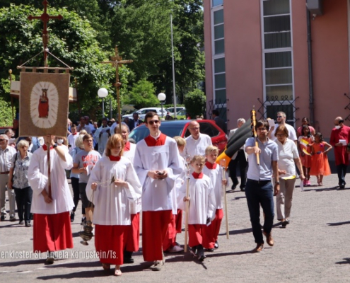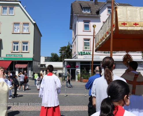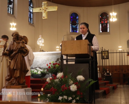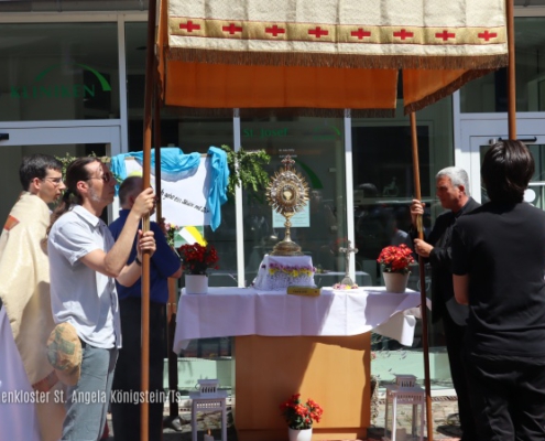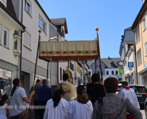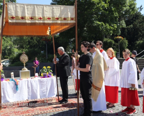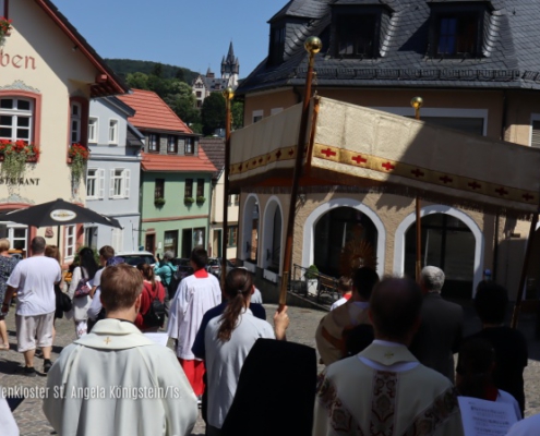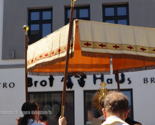 Die Freude ob dieser ersten Feier des Fronleichnamsfestes mit Prozession nach zwei Jahren war groß – man konnte sie den zahlreich in der Pfarrkirche versammelten Menschen, gestärkt durch die auch zahlreich anwesenden Gottesdienstbesucher unserer Klosterkirche und fünf Schwestern unserer Gemeinschaft, ansehen. Pfarrer Peter wurde unterstützt durch zwei Patres der Legionäre Christi, die die Heilige Messe mitzelebrierten. Der noch sehr jungen Schar der Ministranten der Pfarrkirche schlossen sich unsere Ministranten an, so dass die Feier des Fronleichnamsfestes in Königstein einen sehr schönen und prächtigen Rahmen hatte – angefangen in der Pfarrkirche, dann die Prozession mit dem Leib Christi in der Monstranz. Man hatte den Eindruck, dass sie unterwegs, auf dem Weg durch die sonnendurchflutete Königsteiner Innenstadt – durch die Hauptstraße, über den Kapuzinerplatz, den Kurpark, am Krankenhaus vorbei, noch anwuchs. Dabei bot der Anblick der Monstranz, des Leibes Christi vor der Bäckerei „Brothaus“ ein tiefsinniges Bild… Und schließlich der Abschluss im Kloster, wo auch, wie an den beiden anderen Altären unterwegs, eine kleine Andacht stattfand: Worte aus der Heiligen Schrift, ein kurzer Impuls – mit Worten der hl. Ursula Ledóchowska über die Eucharistie, und Fürbitten. Das imposante Orgelspiel des jungen Organisten der Pfarrei verlieh dem Fest einen sehr feierlichen, um nicht zu sagen prunkvollen Ton.