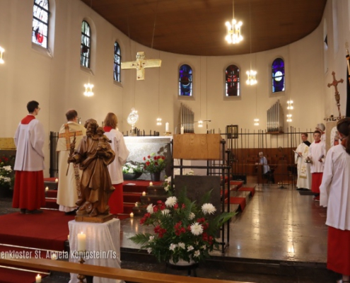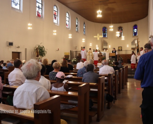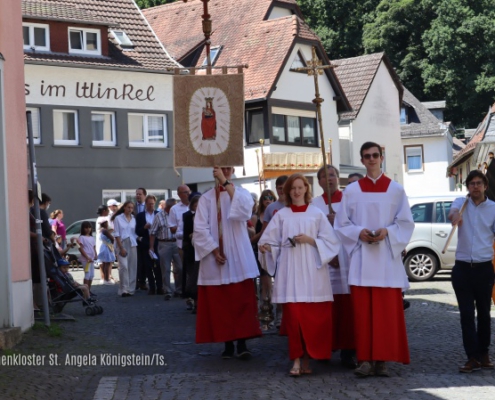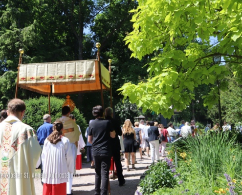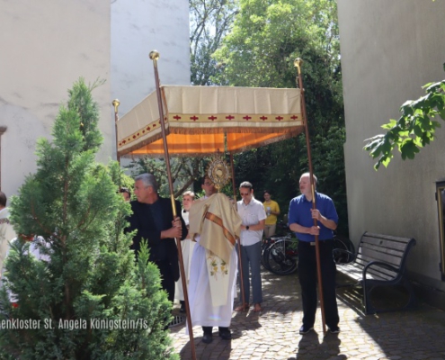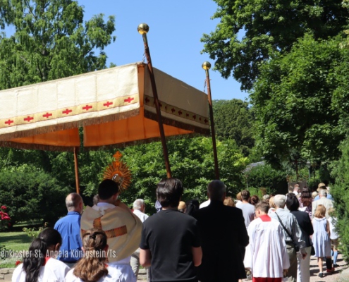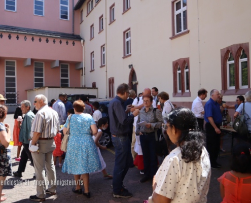 Am 16. Juni 2022 hatten wir nach zwei Jahren Corona-Pause wieder die Möglichkeit, an einer Fronleichnamsprozession teilzunehmen. Das Besondere dabei war, dass dies eine Prozession war, die gemeinsam mit unserer Königsteiner Pfarrei Mariä Himmelfahrt organisiert wurde – anknüpfend an eine Initiative, die kurz vor der Corona-Pandemie ins Leben berufen wurde. Ihre Besonderheit bestand und besteht darin, dass die Prozession in unserer Klosterkirche endet und die Teilnehmer danach die Möglichkeit zu Begegnung und Austausch haben – bei Gebäck und einem Glas Wasser, Saft o.ä…