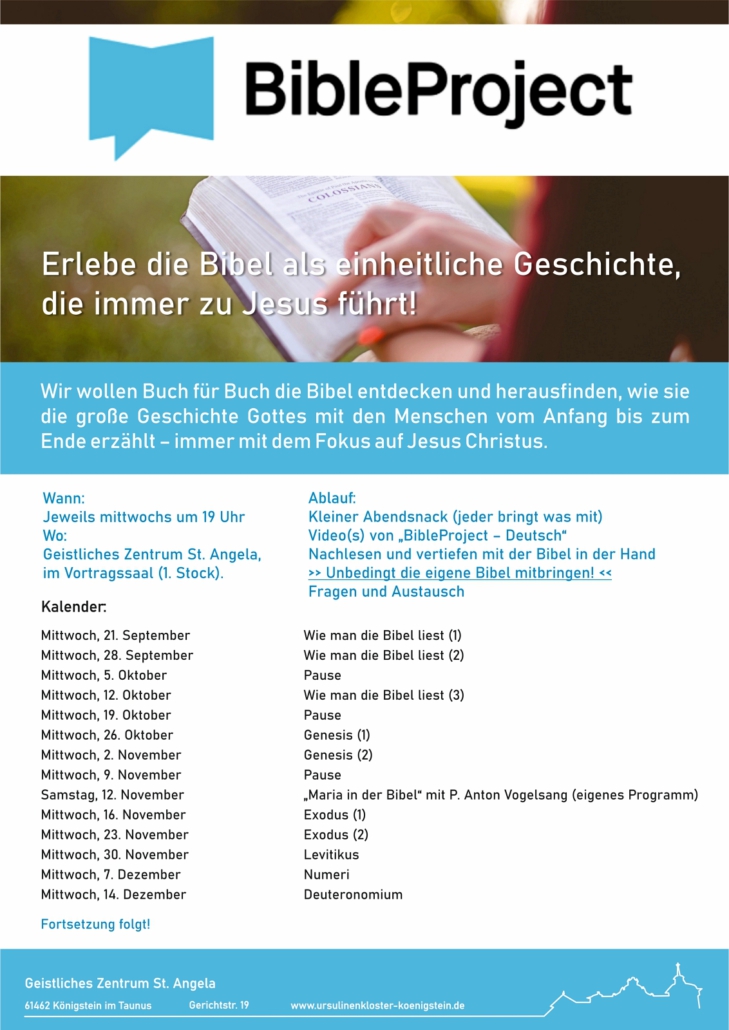 Das BibleProject hat begonnen – ein neues Angebot des Geistlichen Zentrums, ein Bibelkurs für Menschen, die die Heilige Schrift kennenlernen möchten.