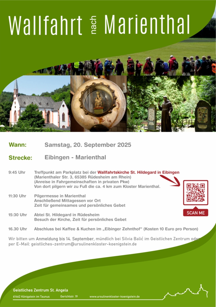 Wir bitten um Anmeldung bis 14. September, mündlich bei Silvia Balić im Geistlichen Zentrum oder per Email an geistliches-zentrum@ursulinenkloster-koenigstein.de