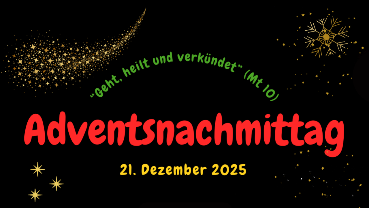 “Geht, heilt und verkündet” (Mt 10) Adventsnachmittag mit Pater Leonhard LC Programm: 13.30-14.00 Uhr Rosenkranz 14.00-15.00 Uhr Impuls: Heilung durch Jesus 15.00-15.15 Uhr Barmherzigkeitsrosenkranz 15.15-16.00 Uhr Stille Anbetung/Möglichkeit der Begegnung 16.00-16.30 Uhr Einzelsegen 16.30-17.30 Uhr Eucharistiefeier ab 17.30 Uhr Lobpreis |